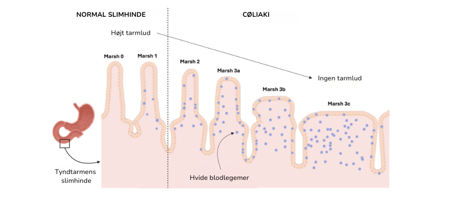 Når personer med cøliaki spiser mad, der indeholder gluten, udløses en inflammatorisk reaktion, som beskadiger tyndtarmens såkaldte tarmlud. Dette reducerer tarmens evne til at optage vigtige næringsstoffer såsom vitaminer og mineraler fra maden. For at vurdere graden af skade på tyndtarmens slimhinde hos personer med mistanke om cøliaki anvendes et system kaldet Marsh-skalaen. Jo højere op på Marsh-skalaen, desto større er sygdomsrisikoen.