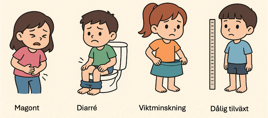 De typiska symtomen på celiaki är magont, diarré, förstoppning, viktminskning och dålig tillväxt. Obehandlad celiaki kan leda till komplikationer som till exempel lågt blodvärde, benskörhet, fertilitetsproblem och en ökad risk för cancer, särskilt lymfom.
