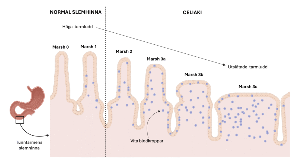 När individer med celiaki äter mat som innehåller gluten sker det en inflammatorisk reaktion som skadar tunntarmens så kallade tarmludd. Detta minskar tarmens förmåga att ta upp viktiga näringsämnen som vitaminer och mineraler från maten. För att bedöma garden av skada på tunntarmens slemhinna hos personer med misstänkt celiaki, används ett system som kallas marsh-skalan. Ju högre up på marsh-skalan desto högre risk för sjukdom.